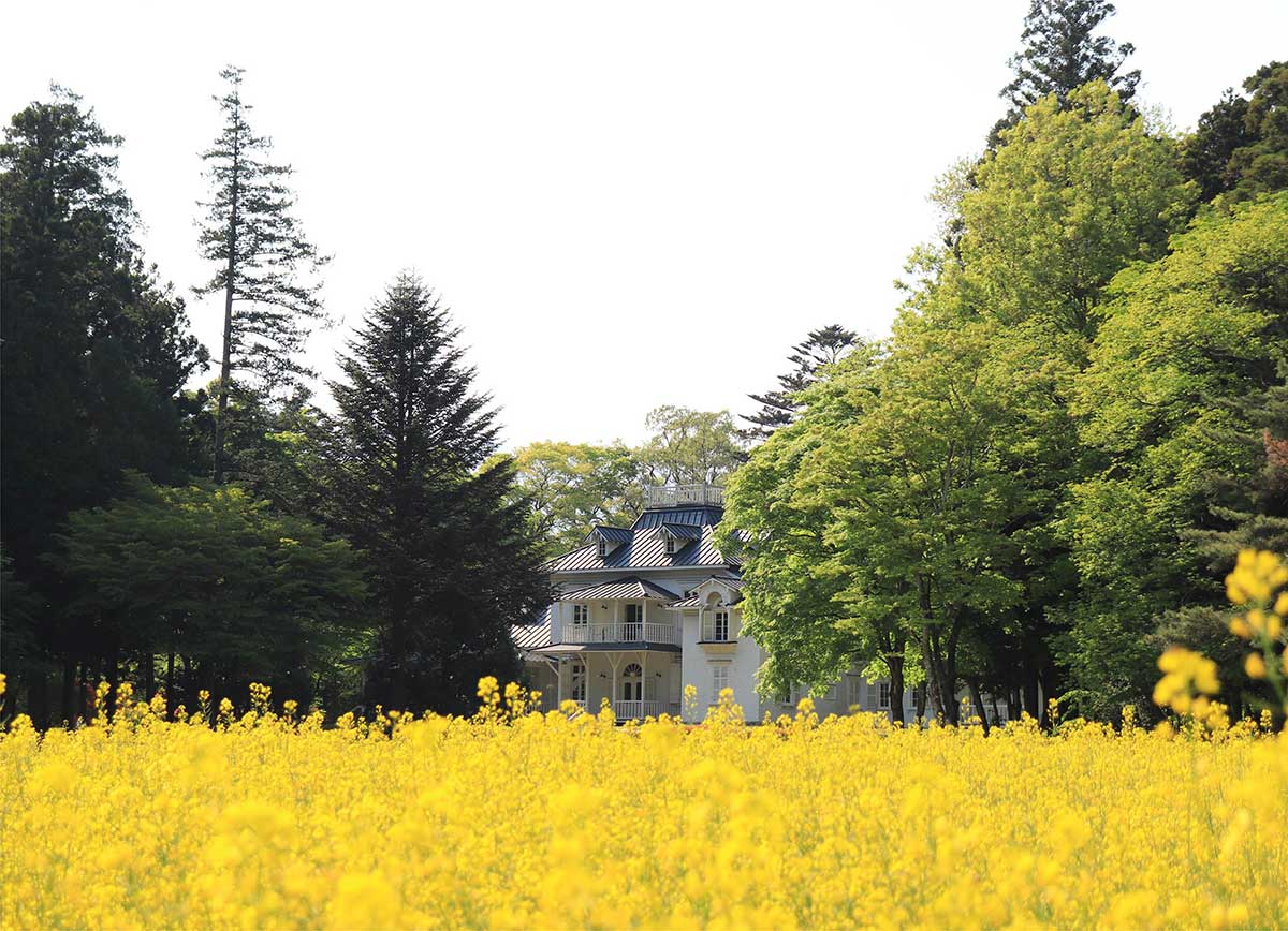 春は菜の花、夏はひまわり、秋はコスモスと、季節のお花が楽しめます。別邸の建物を背景にお花を撮影する人も多く、フォトスポットとしても人気です。「ハンナガーデン」の「ハンナ」は、青木周蔵とその婦人との間に生まれた娘の名前から付けられています。